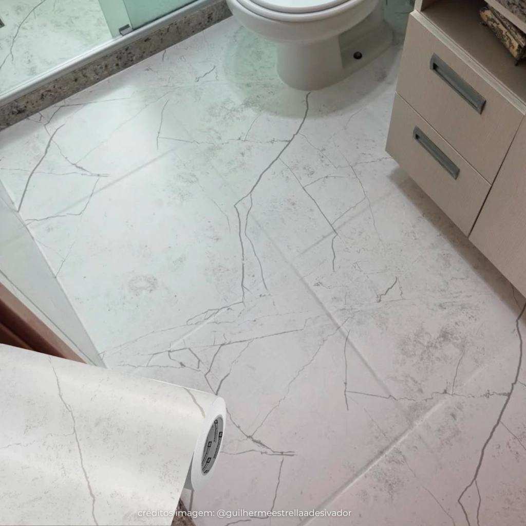 O Adesivo para Piso Mármore Branco Marquina Fosco – 1,22m é um vinil adesivo premium, grosso e resistente, feito especialmente para pisos e áreas úmidas.