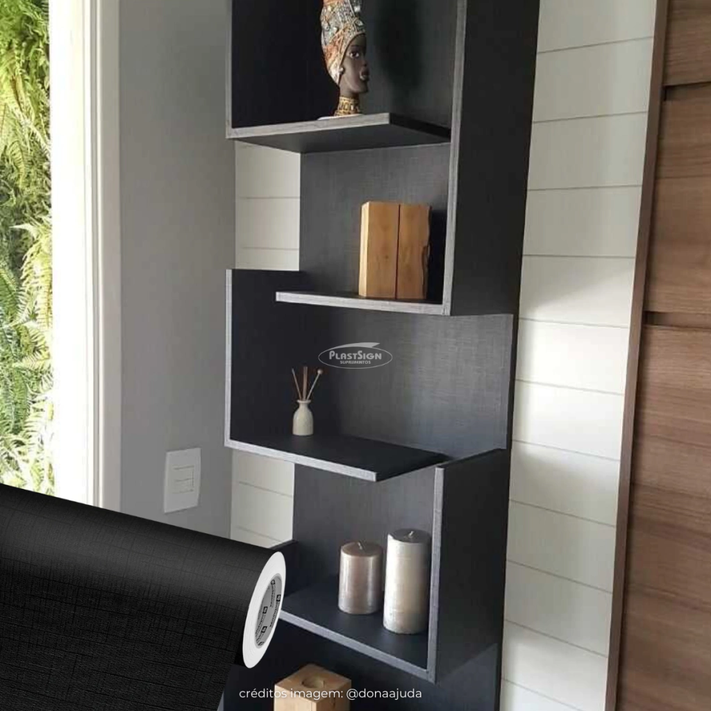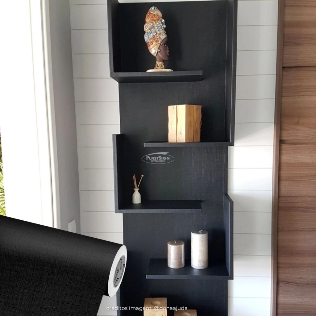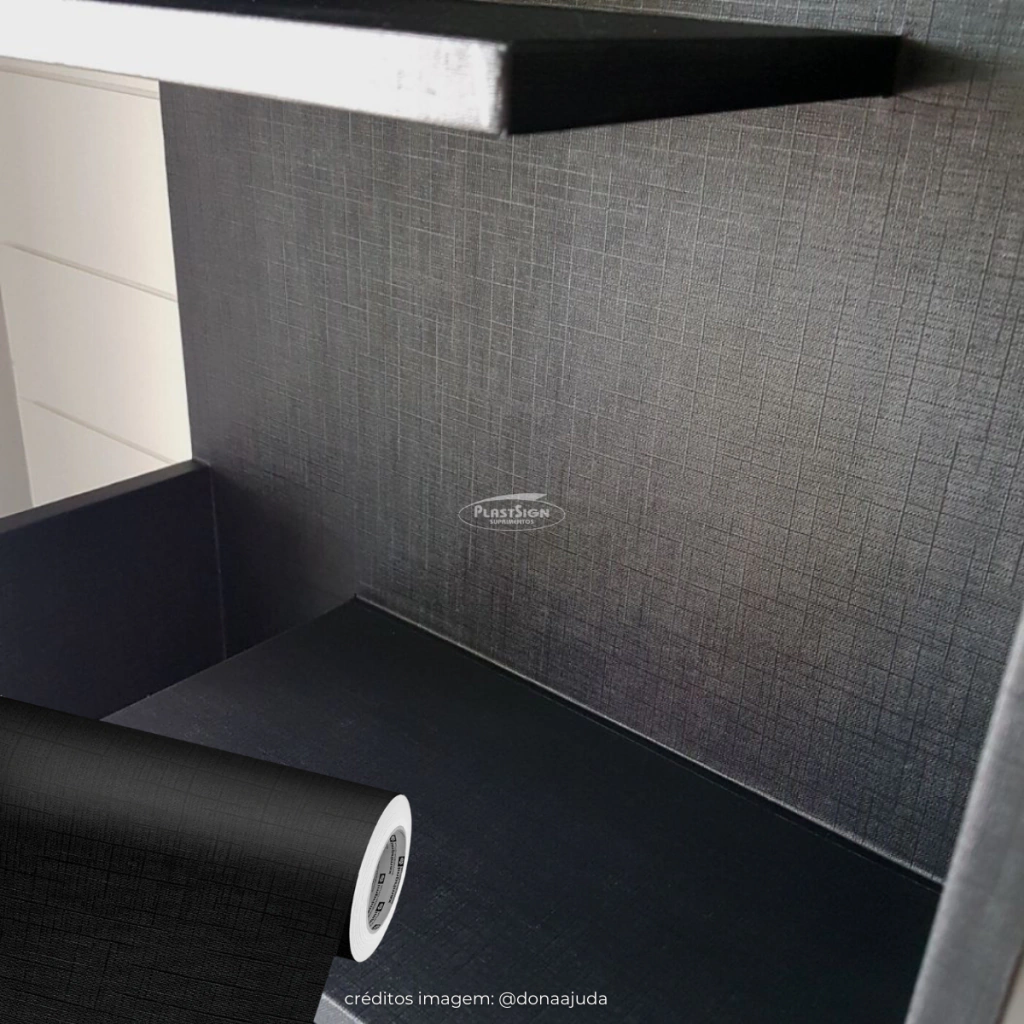O Adesivo Telado Preto – 1,22m é um vinil adesivo premium, lavável, resistente e texturizado, com acabamento que reproduz fielmente o tecido linho em preto absoluto.