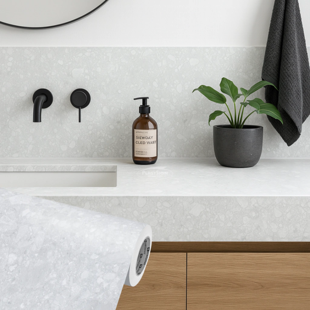 Inspirado no tradicional revestimento de pedra terrazzo, ele proporciona um visual moderno, sofisticado e atemporal, perfeito para cozinhas, banheiros, salas e espaços comerciais. Além da estética, é um material lavável, resistente à umidade e de fácil aplicação, ideal para quem busca praticidade na decoração.
